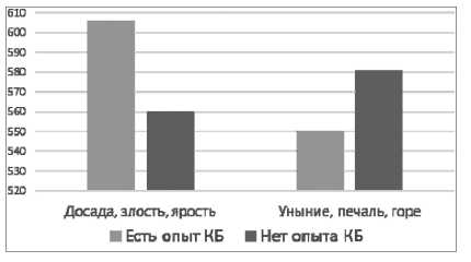 По наличию опыта кибербуллинга (данные ответов на открытый вопрос) респонденты были разделены на 2 группы: с наличием опыта кибербуллинга и с от сутствием такого опыта. Были получены следующие групповые различия (рис. 4). По опыту кибербуллинга различаются статистически значимо эмоции по всем ситуациям вместе, по группам эмоций: досада, злость, ярость (p=0,011) и уныние, печаль, горе (p=0,035).