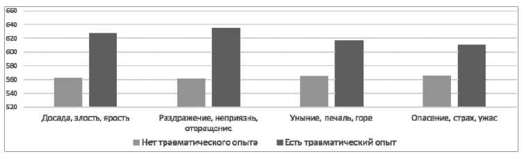 По наличию травматического опыта респонденты были разделены на 2 группы: с травматическим опытом и без травматического опыта. Были получены статистически значимые различия оценки эмоций по группам: досада, злость, ярость (p=0,004); раздражение, неприязнь, отвращение (p=0,001); уныние, печаль, горе (p=0,003); опасение, страх, ужас (p=0,025) (рис.5).