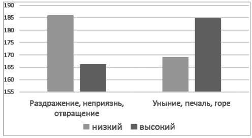 Мы сравнили, как люди, в зависимости от уровня когнитивной эмпатии, реагируют на предложенные ситуации. По уровню когнитивной эмпатии различаются статистически значимо эмоции по всем ситуациям вместе, по группам: раздражение, неприязнь, отвращение (p=0,016) и уныние, печаль, горе (p=0,024). Люди, имеющие низкий уровень когнитивной эмпатии в целом, чаще оценивают ситуации кибербуллинга через эмоции: раздражение, неприязнь, отвращение, чем люди с высоким уровнем когнитивной эмпатии. Люди, имеющие высокий уровень когнитивной эмпатии в целом, чаще оценивают ситуации кибербуллинга через эмоции: уныние, печаль, горе, чем люди с низким уровнем когнитивной эмпатии (рис. 6).