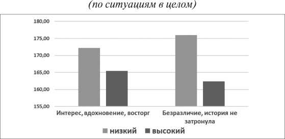 По уровню отзеркаливания эмоций различаются статистически значимо эмоции по всем ситуациям вместе, по группам: одобрение, принятие (p=0,037); настороженность, недоумение, шок (p=0,001); безразличие, история не затронула (p=0,000); уныние, печаль, горе на уровне тенденции (p=0,054) (рис. 10). Люди, имеющие низкий уровень отзеркаливания эмоций в целом, чаще оценивают ситуации кибербуллинга через эмоции: одобрение, принятие и безразличие, история не затронула, чем люди с высоким уровнем отзеркаливания эмоций. Люди, имеющие высокий уровень отзеркаливания эмоций в целом, чаще оценивают ситуации кибербуллинга через эмоции: уныние, печаль, горе на уровне тенденции и настороженность, недоумение, шок, чем люди с низким уровнем отзеркаливания эмоций.