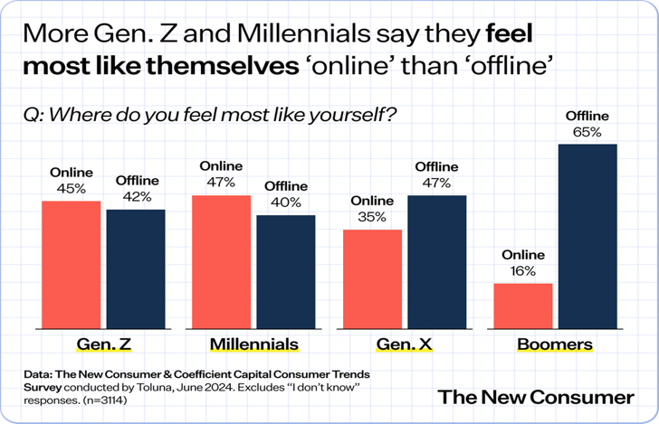 - The New Consumer. Consumer Trends Highlights: More Gen Z and Millennials say they feel most like themselves “online” than “offline”. (2024). Retrieved from https://newconsumer.com/2024/09/consumer-trends-highlights-digital-natives-tiktok-china-food-as-medicine/
