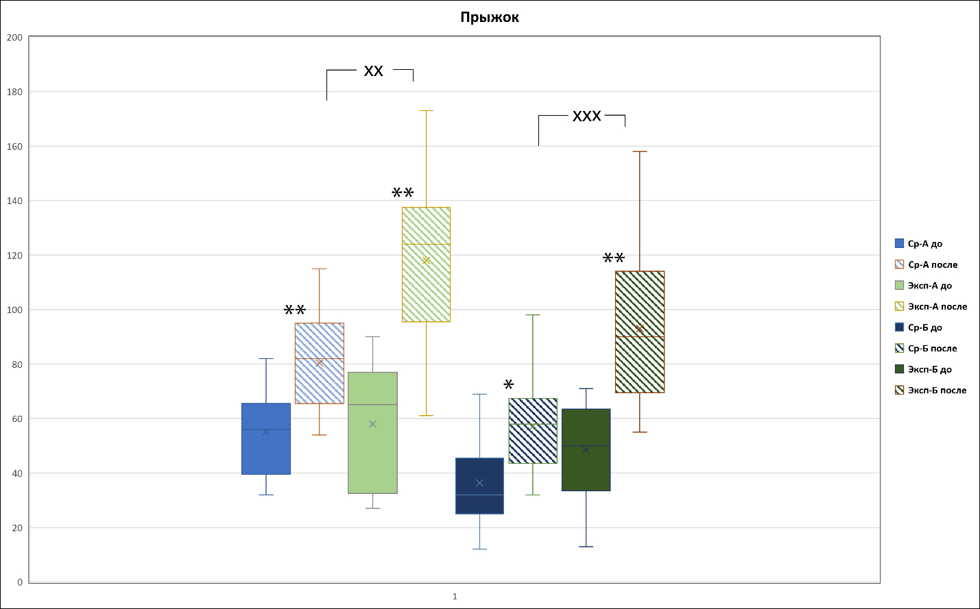 Примечание: По оси У – длина прыжка в см. * достоверные различия между подгруппами по критерию Манна-Уитни до и после курса занятий (**– p < 0,01, ***– p < 0,001), х – достоверные различия между экспериментальной и сравнительной группами.