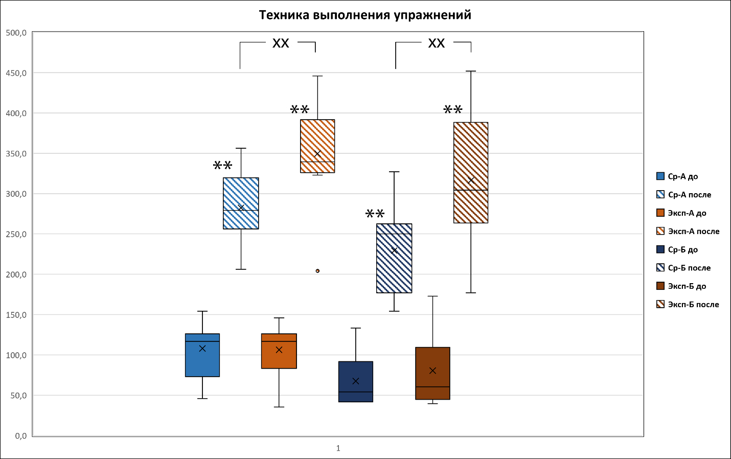 Примечание: По оси Y – баллы. По оси У – баллы. * достоверные различия между подгруппами по критерию Манна-Уитни до и после курса занятий (**– p < 0,01, ***– p < 0,001), х – достоверные различия между экспериментальной и сравнительной группами.