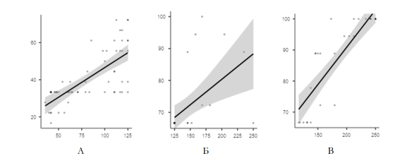 Примечание: По оси Х «понимание инструкций» в суммарных баллах, по оси У – длина прыжка в см. А – до начала занятий (R = 0,670 при р < ,001) (объединенная группа сравнение + эксперимент); Б – после курса занятий (R = 0,742 при р < ,001) (группа сравнения); В – после курса занятий (R = 0,677 при р < ,001) (эксперимент)