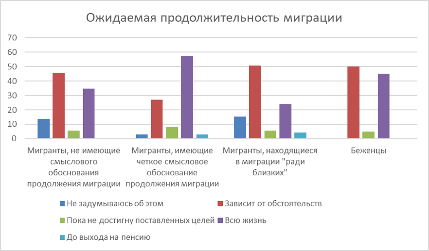 Совершенно иная картина в группе опрошенных, имеющих четкую актуальную мотивацию миграции. Почти 60% респондентов заявляют о выборе в пользу пожизненной миграции, и чуть менее 10% связывают сроки миграции с достижением поставленных целей; при этом не готовы задумываться о будущем своей миграции всего 3% опрошенных из этой группы. Полученные данные указывают на более выраженную интернальность, тенденцию к принятию ответственности и реализации миграционного проекта с позиций авторства, осознанность и готовность к анализу своего жизненного пути и миграции, как его части.