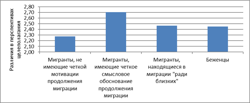 Рис. 2. Различия в перспективах целеполагания в группах мигрантов с различным смысловым обоснованием продолжения миграции