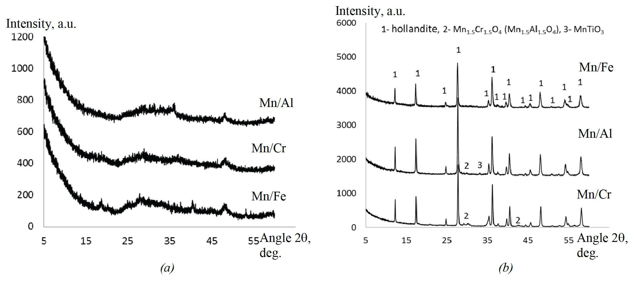 The chemical composition of the obtained ceramics (Table 1) allows us to classify the obtained substances as K1.3Mn1.5Al0.2Ti6.2O16, K1.4Mn1.4Cr0.2Ti6.4O16 and K1.3Mn1.6Fe0.2Ti6.2O16 hollandite-like solid solutions with similar structure and composition. This formula corresponds to the general stoichiometry KxMe3+yTi8–yO16 (x ≈ y), which is traditionally recognized in the literature for such substances and indicates the presence of manganese in the Mn3+ state, similar to the hollandite-like solid solutions based on PPT-Mn intermediates [7].