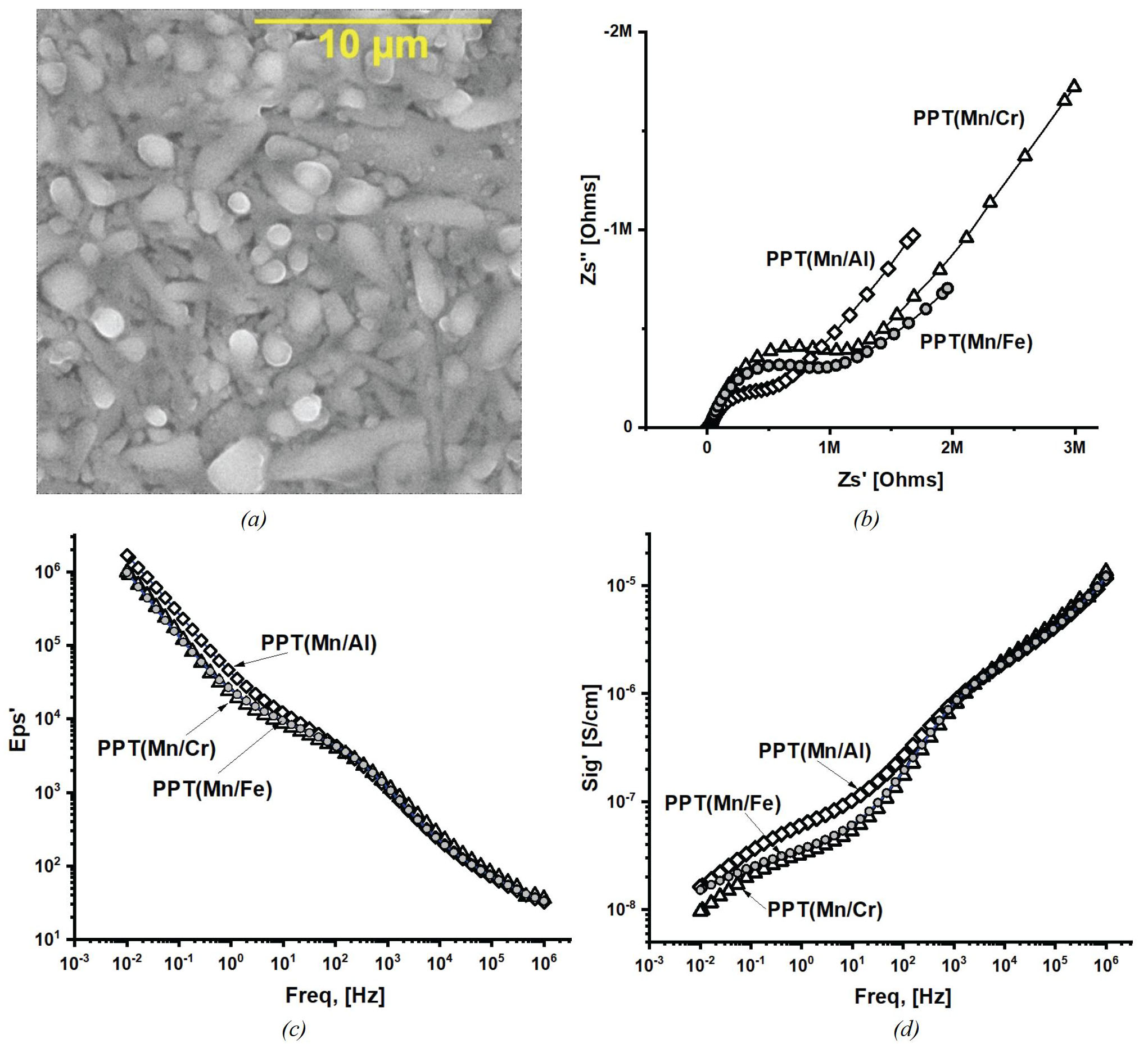 Fig. 2. Typical fracture surface of the ceramic sinter (PPT-Mn/Cr) (a), Cole-Cole plots of the impedance data (b) and frequency dependences of permittivity (c) and conductivity (d) for the sinters based on varios PPT-Mn/R3+ intermediates