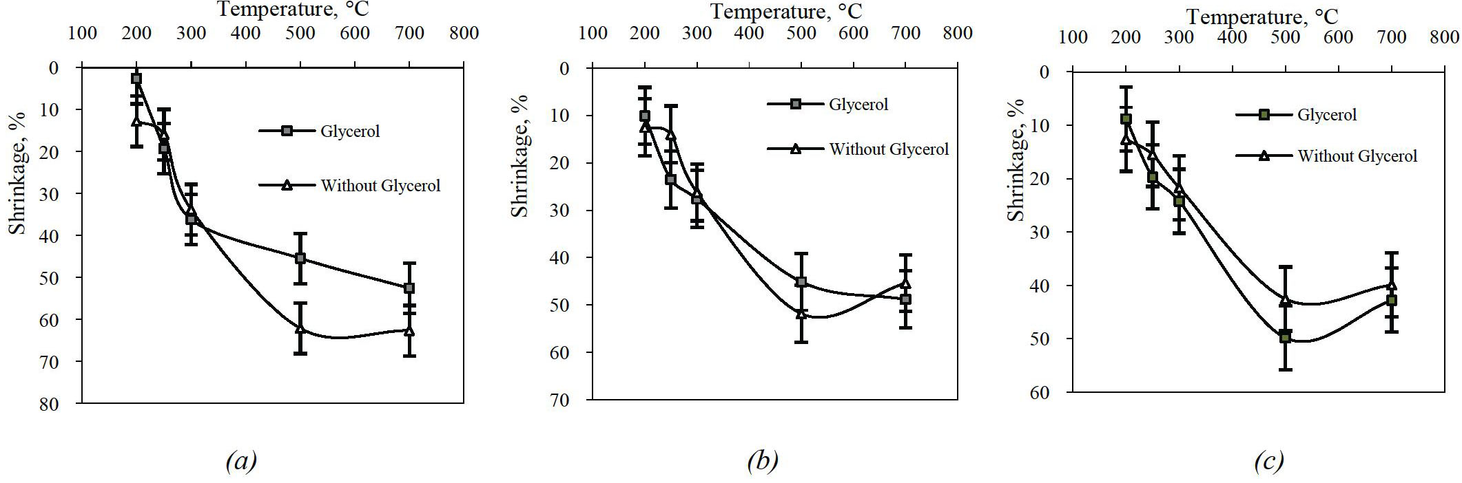 The comparison of different copolymers shows that the smallest shrinkage was observed in the case of PAN-IA membranes (40–50 %) (Fig. 3c). The membranes obtained from PAN slightly exceeded them in terms of shrinkage (45–52 %) (Fig. 3a), while the samples from PAN-MA lost more in size (52–62 %) (Fig. 3b). In addition, samples from PAN-IA were more resistant to cracking during the pyrolysis.