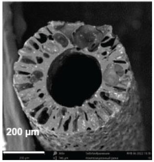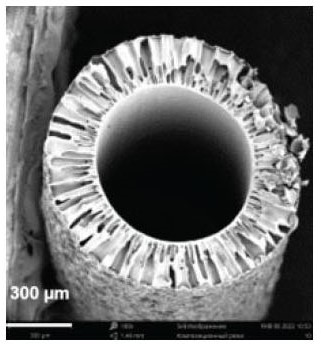The hollow fibers were fabricated using various conditions: the polymer solution pressure was 200–250 kPa, the coagulant pressure was 30 kPa, the bore fluid temperature was 30 °C, and the temperature of the receiving (external coagulation) bath was 15 °C, the temperature of the polymer solutions was 40–50 °C, the air humidity was 55 %. The air gap distance was 80 cm. The outer diameter of the spinneret was 1.8 mm, the inner diameter was 0.8 mm. The spinning modes for forming PAN hollow fiber membranes were selected in accordance with the rheological behavior and properties of the polymer solution, which are given in [38].