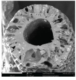 The geometric parameters of the hollow fiber membranes dried without glycerol differ from those impregnated with glycerol: the inner diameter and the wall thickness (L) of the fibers is 20–25 and 20 µm larger, respectively. At the same time, the water permeability of hollow fiber membranes dried without glycerol is lower by 20–25 %. Thus, drying without a plasticizer (glycerol) leads to the collapse of the pores of the selective layer. Moreover, the use of a plasticizer protects the pores during drying but increases the shrinkage of the hollow fiber matrix. The increase of shrinkage is due to the increase of the mobility of polymer chains plasticized with glycerol which facilitates their rearrangement while drying.