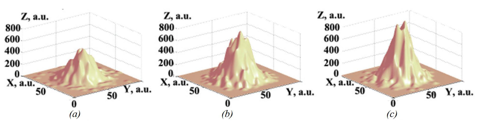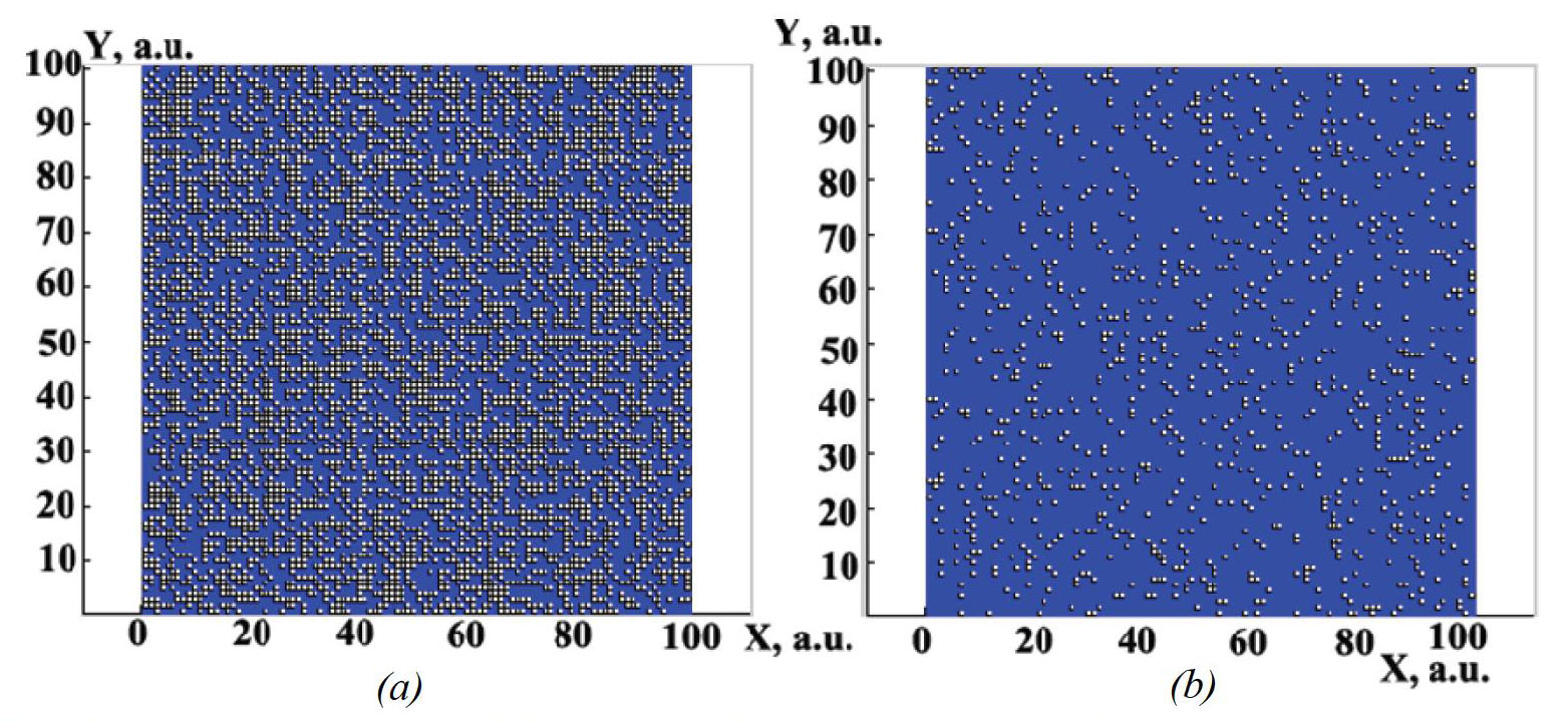 Figure 5 shows model qualitative images of a system of fractal/dendritic nanoclusters in Cartesian coordinates in a.u., deposited from a colloidal solution onto a solid substrate. They were formed within the framework of the DLA model, where a horizontal plane (x, y) was chosen as the seed structure, and the value of s was set to 1 (Fig. 5a). The case was also considered where the variable value of s depended on the current maximum height h of the forming structure, as shown in the figure (Fig. 5b). This value increases to the required maximum height h = H (see Fig. 6). In this model, we assume that s = h/H, so that over time, the value of s increases from 0 (h = 0) to 1 (h = H).