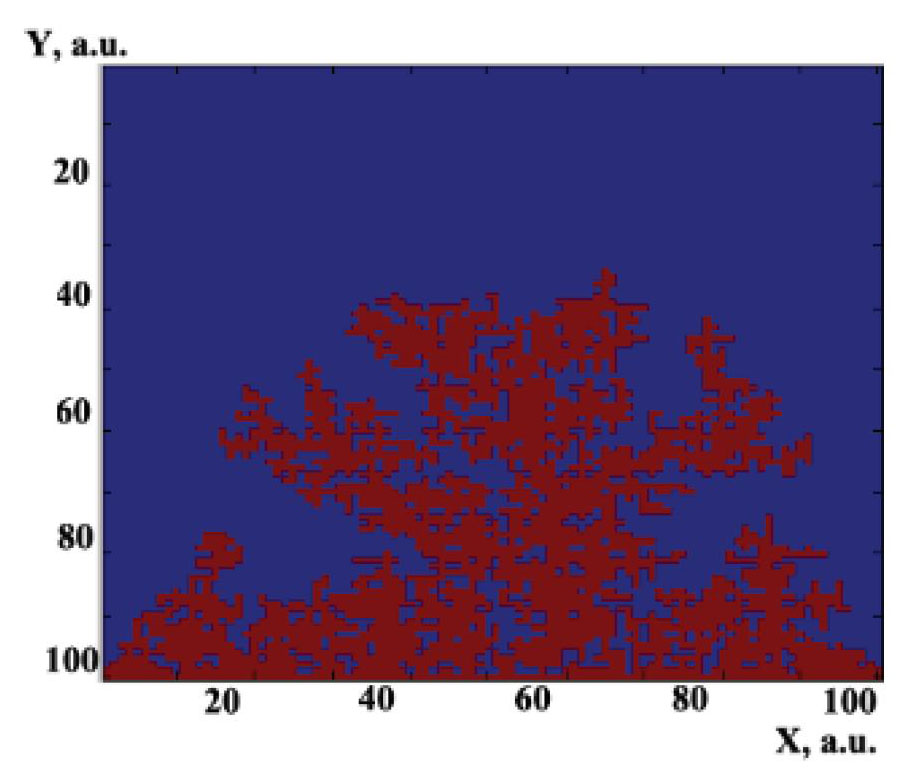 The modeling of the cluster formation process was carried out within the framework of diffusion-limited aggregation (DLA) [43], which describes aggregates both in the colloidal system and in their structures deposited on a solid surface.