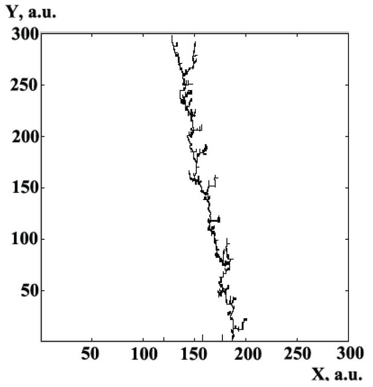 Figure 9 shows model images of nanowires (filamentary objects) with nanofragments (though in a. u., they depend on the control parameter – adhesion probability s and branches on their predominantly linear structure in the DLA approximation within a computational domain of 300 × 300 a. u. for 30,000 particles. In Figure 9a, the case of equal-probability displacement of diffusing nanoparticles with a constant s = 1 is shown. Figure 9b presents a model of the nanowire system with small lateral displacements of the diffusing particles and a uniform decrease in the adhesion probability from 1 to 0.01. Figure 9c depicts a nanowire system with small lateral displacements of diffusing particles and a uniform decrease in the adhesion probability s, from 0.5 to 0.01. The case of small lateral displacements of diffusing particles allows for qualitatively accounting for the effect of the applied external electric field, where the structure growth occurs predominantly along the lines of the field's intensity. The above-mentioned change in adhesion probability corresponds to the cooling of the system after laser exposure, analogous to experimental conditions. In both cases, the generation process stopped when the nanowire reached the upper boundary of the computational domain. Comparing Figures 9a, 9b, and 9c, it can be concluded that the probability of random lateral displacements affects the shape of the nanowire. In the case of low lateral displacement probabilities, the nanowires generated are more vertically elongated with smaller and fewer lateral branches.