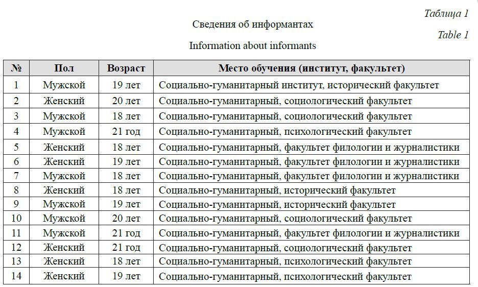 Методом глубинного интервью, основанного на методологии качественного социологического исследования (Готлиб 2002), было опрошено 14 обучающихся (7 девушек и 7 юношей), отобранных целевым способом, где критерием отбора выступил статус малоимущего одиноко проживающего студента или студента – члена семьи, имеющей доход ниже прожиточного минимума (табл.1).