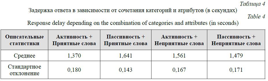 Критерий Колмогорова-Смирновa показал наличие нормального распределения времени задержки реакции при отнесении стимулов к группам: Активность + Приятные слова (р=0,097), Пассивность + Приятные слова (р=0,200), Активность +Неприятные слова (р=0,200), Пассивность + Неприятные слова (р=0,200).