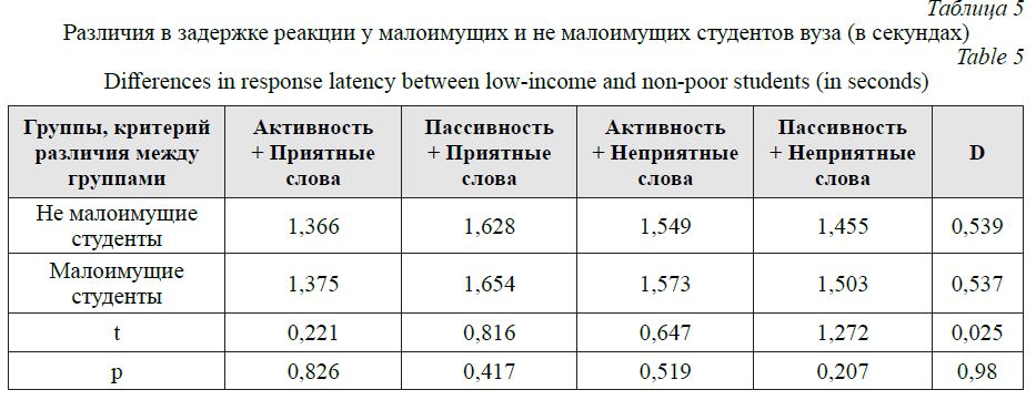Результаты данного этапа исследования свидетельствуют об отсутствии значимых различий в неявных установках малоимущих и не малоимущих студентов. У обеих групп обучающихся сформированы позитивные проактивные установки.