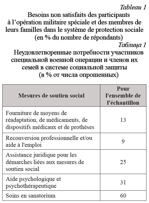Les répondants expriment un besoin pour les mesures de soutien social suivantes, qu'ils ne reçoivent pas encore: 60 % nécessitent des soins en sanatorium, 31 % ont besoin d’un soutien psychologique et psychothérapeutique, 25 % recherchent une assistance juridique pour les démarches liées aux mesures de soutien social, 13 % demandent la fourniture de moyens de réadaptation, de médicaments, de dispositifs médicaux et de prothèses, et 9 % souhaitent une reconversion professionnelle et/ou une aide à l’emploi (tabl. 1). Les mesures de soutien récréatives et psychologiques contribuent à l'adaptation sociale et à l'intégration des participants à l’opération militaire spéciale dans la société.