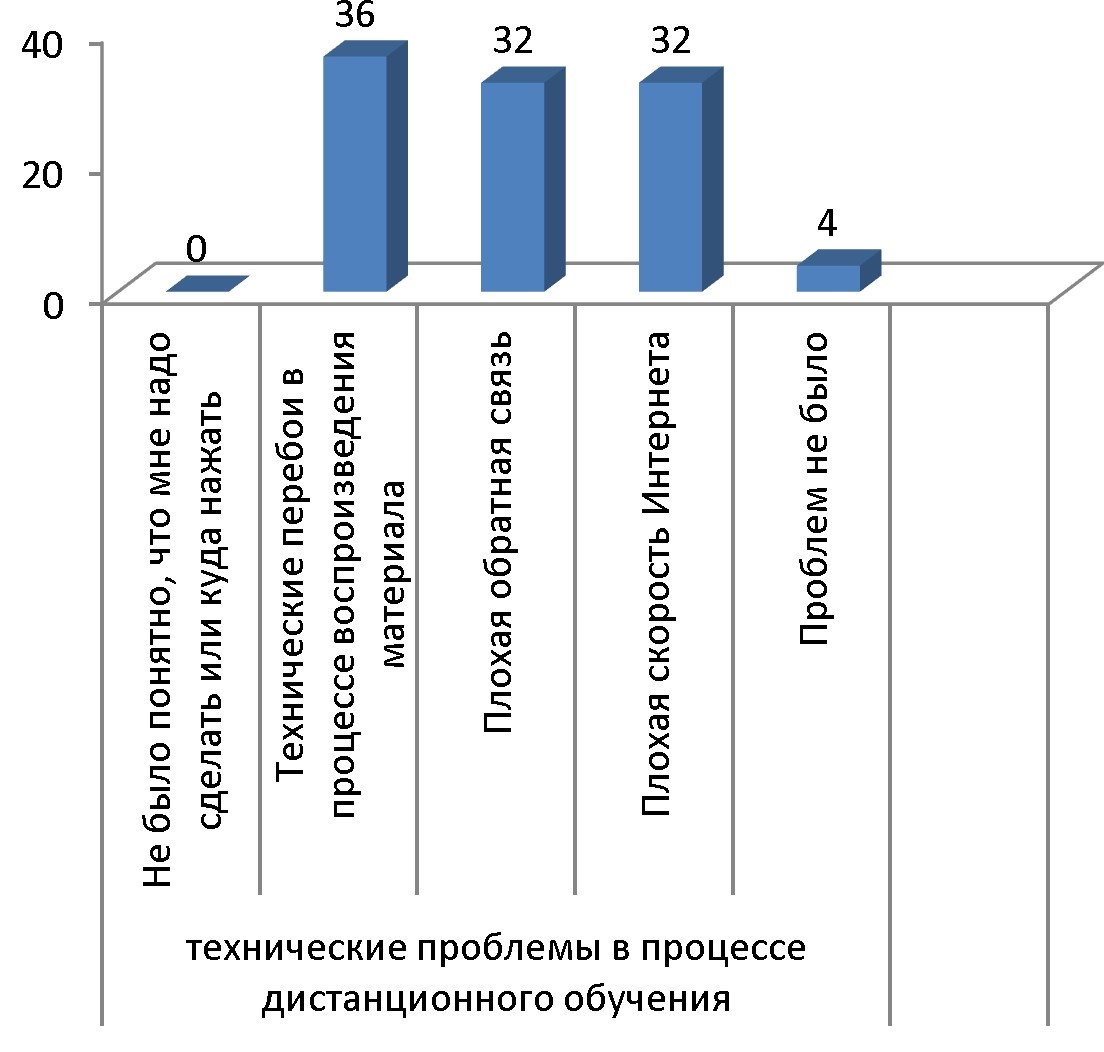 В качестве основных технических проблем в процессе дистанционного обучения студенты медико-профилактического факультета указывают на технические перебои в процессе воспроизведения материала (36%), плохую обратную связь (32%) и плохую скорость Интернета (32%).