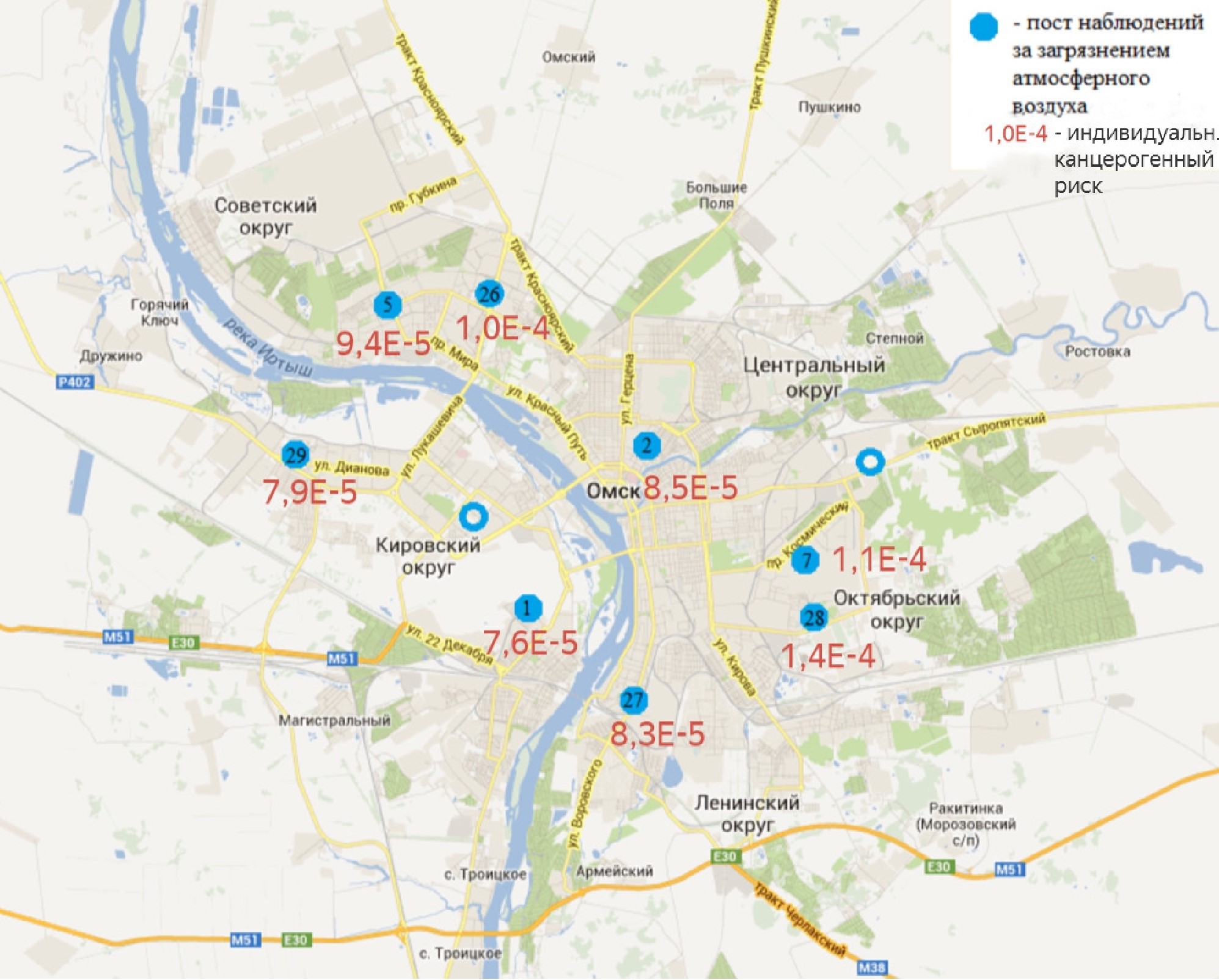 На протяжении всего периода наблюдения – среднегодовой уровень канцерогенного риска здоровью населения, в целом для города Омска, находился выше допустимого значения и оценивался как настораживающий [9].