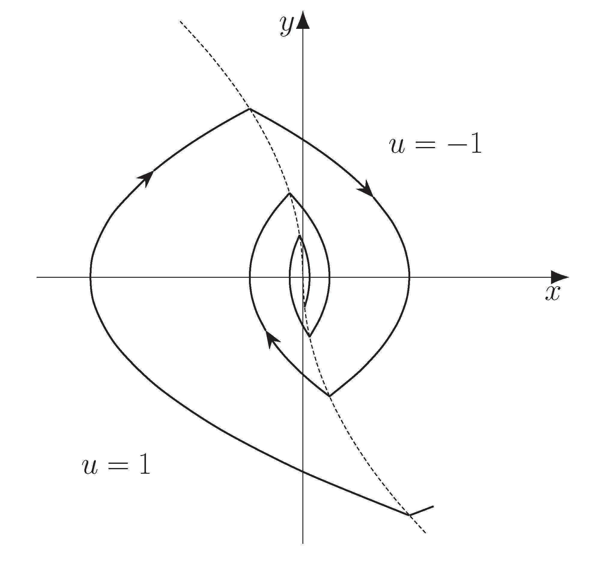Здесь начало координат является особой экстремалью второго порядка. Для задачи Фуллера построен полный синтез оптимальных траекторий (см., например, [1]). Доказано, что оптимальные траектории попадают в 0 за конечное время, при этом управление на оптимальной траектории имеет счетное число неустранимых разрывов, а именно, счетное число переключений с 1 на -1 (феномен Фуллера, см. рис. 1). Такие траектории называют четтеринг-траекториями.