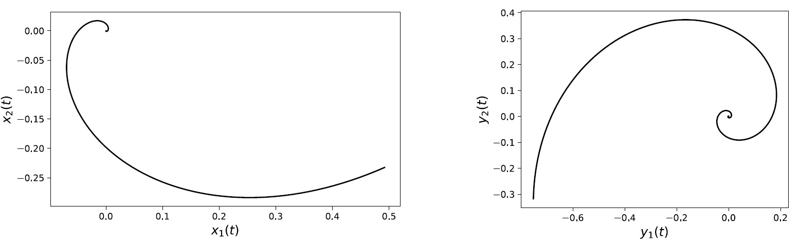 Задачи (10) и (11) отличаются от модельной наличием слагаемых и ( для маятника и диагональная матрица для балки Тимошенко). Размерность гамильтоновых систем в этих задачах равна 8, поэтому теорема 1 здесь неприменима. С использованием аналогичных рассуждений нами было показано, что семейство логарифмических спиралей является оптимальным в этих задачах (см. [16, 18]).