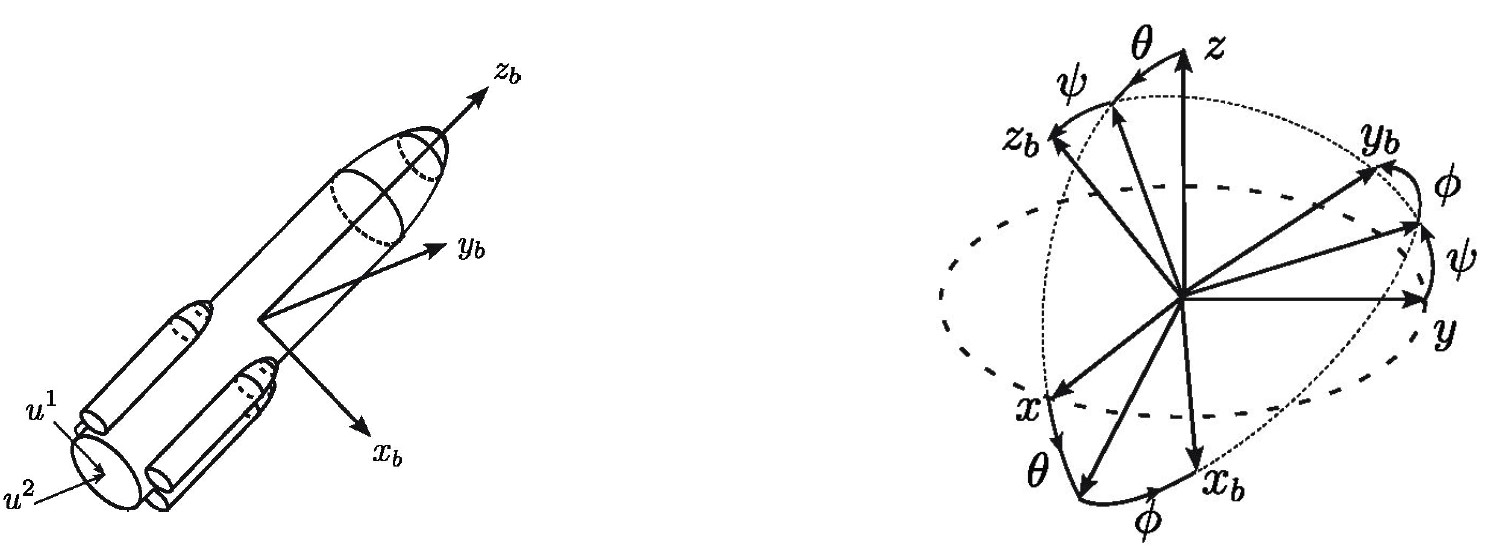 Уравнения движения ракеты состоят из уравнений орбитальной динамики (уравнения на скорости , , ), кинематических уравнений Эйлера (уравнения на углы Эйлера , , ) и динамических уравнений Эйлера (уравнения на угловые скорости , ). Ракета управляется моментом силы тяги , управление ограничено единичным кругом.