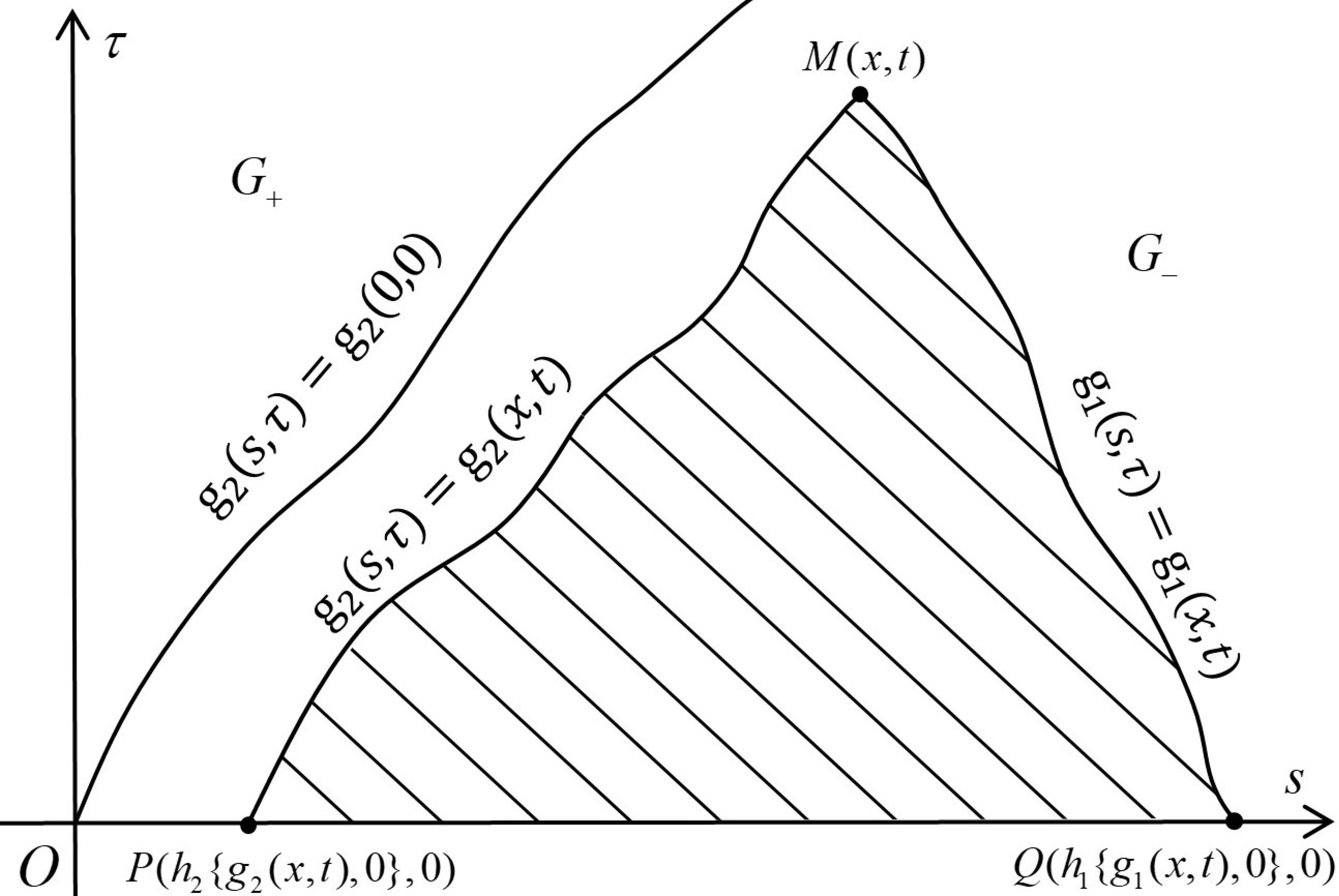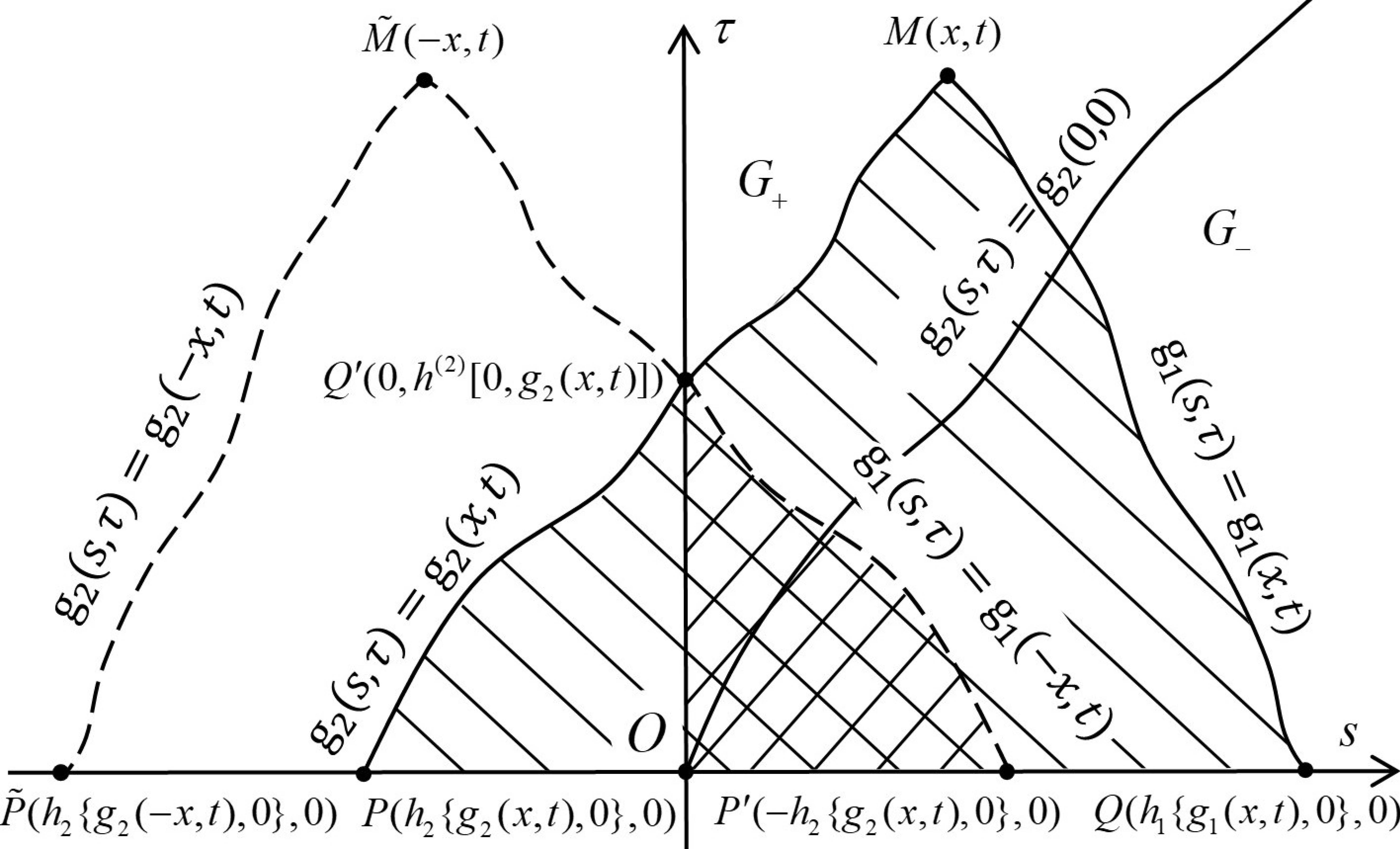в котором вычитаемое непрерывно дифференцируемо и поэтому оно удовлетворяет интегральным требованиям гладкости (3.1) на . Благодаря линейности этой задачи Коши её решение представимо в виде суммы решения задачи Коши (3.16), (3.17) при , , и решения задачи Коши (3.16)(3.17) при , , . Первая задача Коши на с граничным режимом (2.3) при становится первой смешанной задачей (2.1)(2.3) на . С одной стороны, по теореме 2 статьи [5] существует единственное классическое решение этой первой смешанной задачи (2.1)(2.3) на . Первая задача Коши на равносильна этой первой смешанной задаче на , так как решение первой задачи Коши по формуле (4) из [20], т.е. по формуле (3.2) из теоремы 3.1, но с крышками над , , , равно , (см. [11, c. 68 – 69]. Ниже перед леммой 3.1 показано, что характеристические треугольники с вершинами , на оси являются <<криволинейными>> равнобедренными. Следовательно, вершины и основания треугольника симметричны относительно оси , начальные данные и нечётны по , функции , , чётны по и поэтому первые два слагаемых в (3.2) обращаются в ноль. Третье слагаемое в формуле (3.2) вида двойного повторного интеграла по при тоже равно нулю.