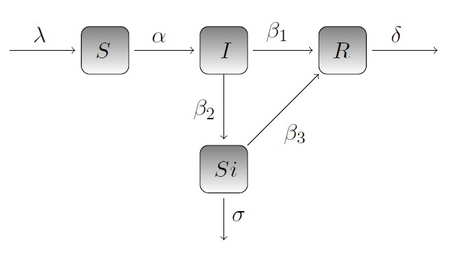 Взаимное перемещение индивидов между этими категориями описывается системой обыкновенных дифференциальных уравнений, причем происходит по сложным схемам (см., например, [19] и рис. 1).