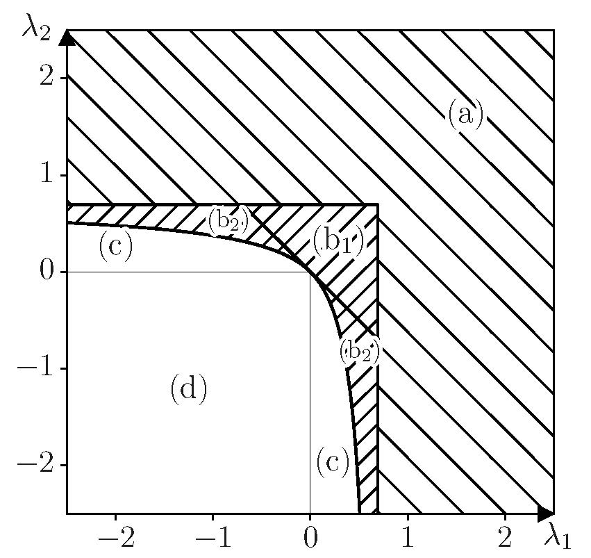 Теорема 4.1. Пусть , определены равенствами (7) и выполнено неравенство . Тогда отображение не имеет периодических точек и, в зависимости от значений , , реализуются случаи (a)–(d), перечисленные ниже и изображённые на рис. 1.
