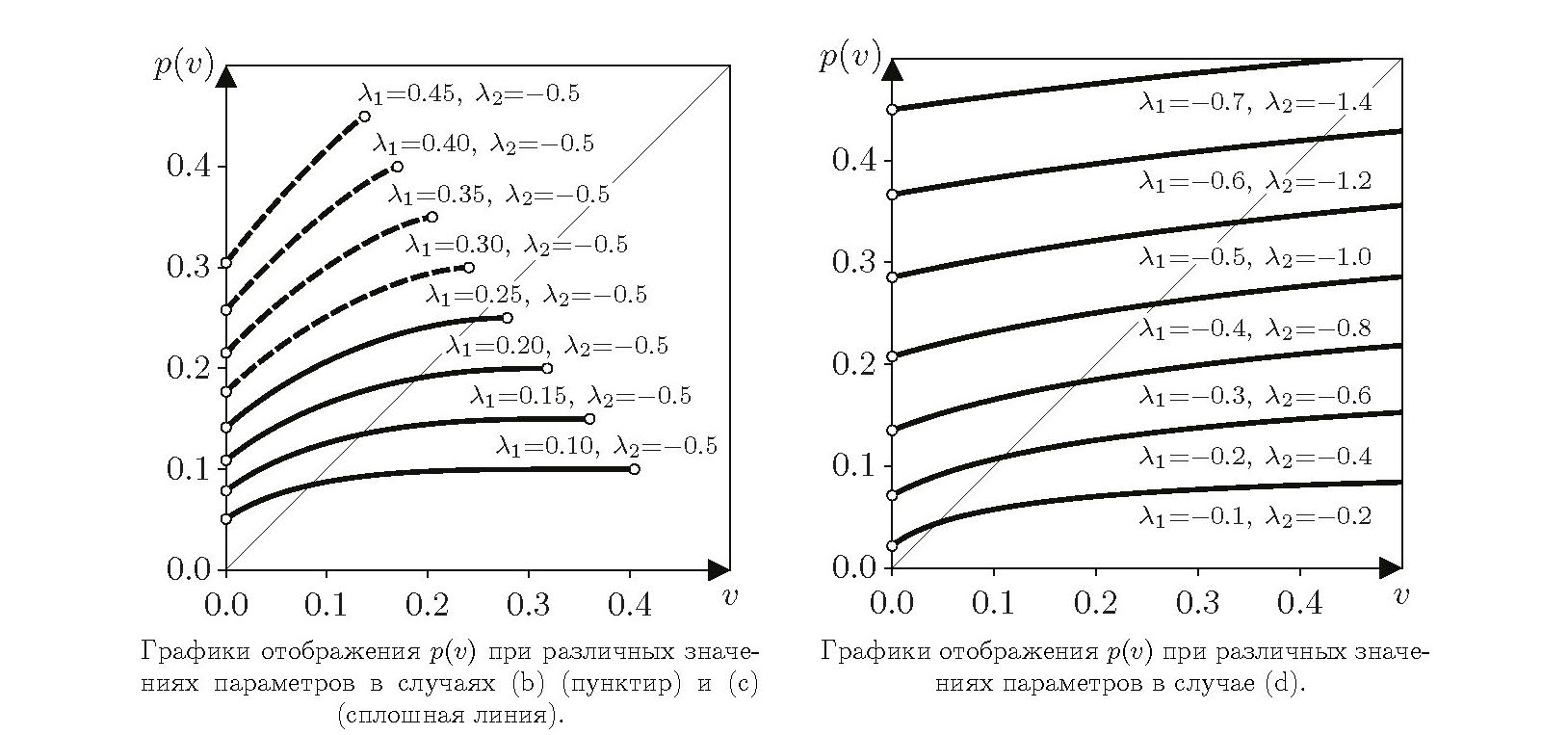 На рис. 2 изображены графики отображения при различных значениях параметров, удовлетворяющих неравенству . Эти графики иллюстрируют наличие экспоненциально устойчивых неподвижных точек в случаях (c) и (d), а также характер появления неподвижной точки при переходе от случая (b) к случаю (c).