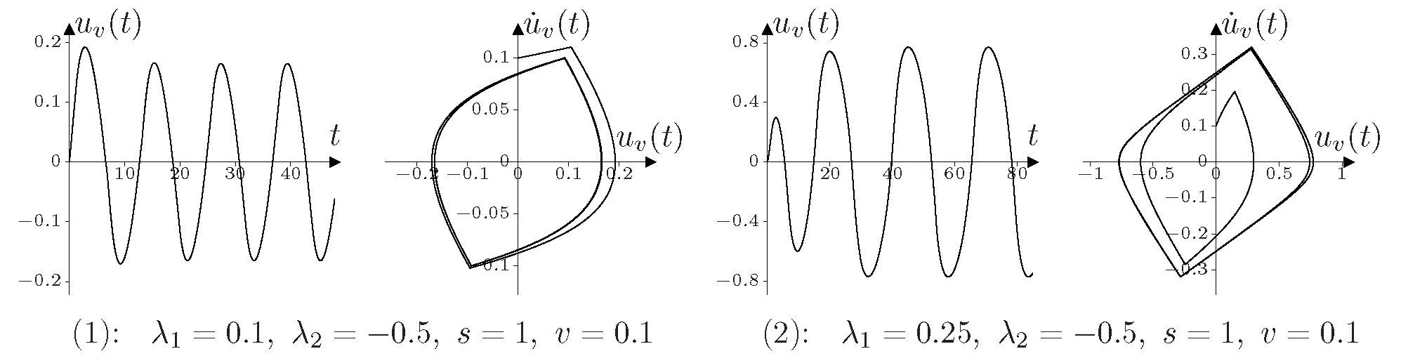 На рис. 3, 4 изображены графики и траектории в фазовой плоскости некоторых решений уравнения (2) с начальными условиями из . Как видно, решения стремятся к некоторым предельным циклам, причём пересечения решениями оси ординат на изображениях фазового портрета соответствуют итерациям отображения . Точки излома на фазовых портретах соответствуют переключениям запаздывающего члена: в этих точках вторая производная решения имеет скачок.
