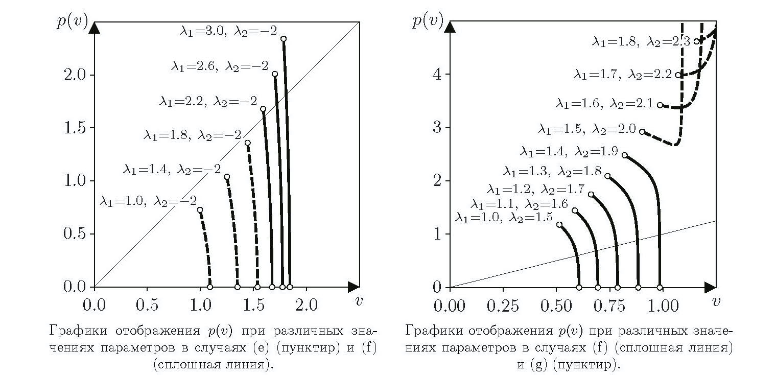На рис. 5 изображены графики отображения при различных значениях параметров, удовлетворяющих неравенству . Эти графики иллюстрируют наличие неустойчивой неподвижной точки в случае (f), а также характер появления неподвижной точки при переходе от случая (e) к случаю (f) и при переходе от случая (g) к случаю (f).