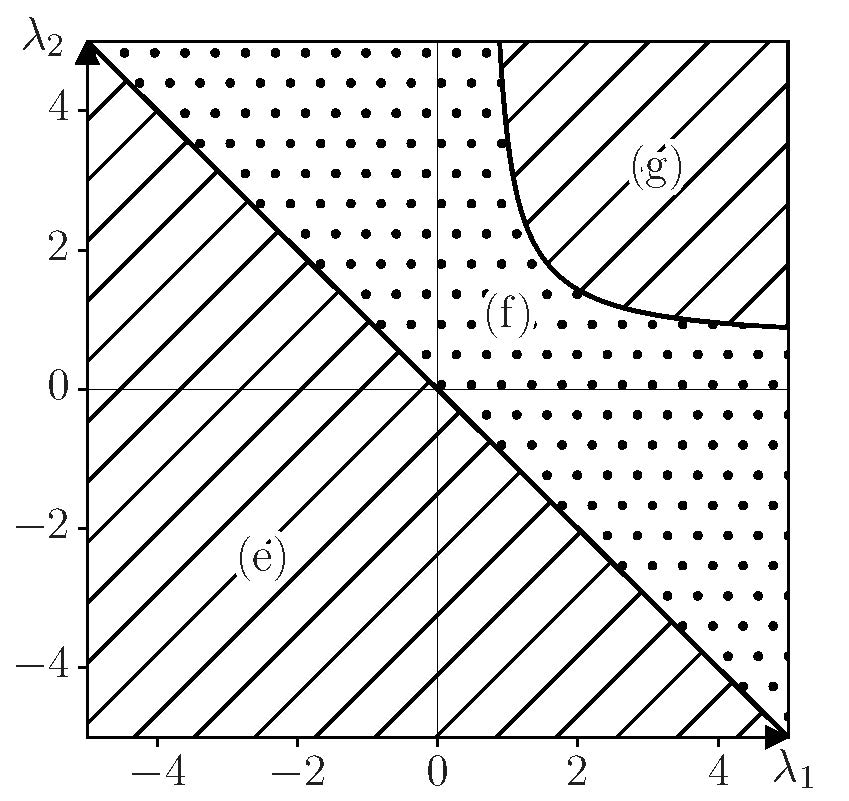 Теорема 4.2. Если выполнено неравенство , то отображение не имеет неподвижных точек. Точнее, в зависимости от значений , , реализуются случаи (e)–(g), перечисленные ниже и изображённые на рис. 6. [(a)]
