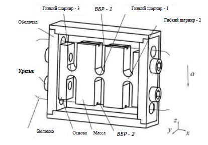 Этот датчик в основном состоит из двух инерционных масс, трех прямых гибких шарниров, двух ВБР и основания. Датчик симметричный, размеры гибких шарнира-2 и шарнира-3 абсолютно одинаковы. Два конца массы снабжены канавками для оптоволокна. Два конца предварительно натянутой ВБР фиксируются в пазах клеем. ВБР подвешивается над гибким шарниром-1, а основание и оболочка пакета соединяются резьбой. Таким образом, датчик одноосный, состоит из двух подобных.