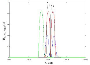 Рис. 9. Спектры компонент (l+l/p)-АВБС при изменении длины l/p-ВБР (L1<L2<L3): Ll (зеленая линия); L1 (синяя линия); L2 (красная линия); L3 (черная линия)