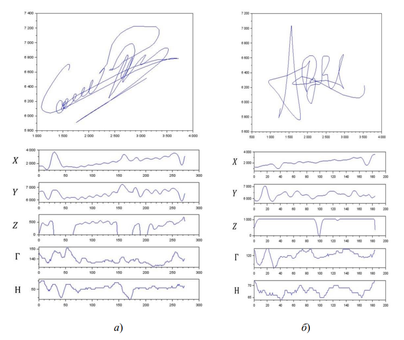 Для решения задачи распознавания рукописных подписей с учётом динамики их ввода был использован набор данных MCYT Signature 100 [12], содержащий рукописные подписи 100 авторов. Разделение набора данных на обучающую и валидационную выборки было проведено в стандартном соотношении 4:1 (4000 и 1000 подписей соответственно), что является общепринятой практикой в задачах машинного обучения и позволяет обеспечить достаточный объём данных для обучения модели и адекватную оценку её качества. Рукописные подписи были введены с использованием графического планшета Wacom INTUOS A6 USB. В процессе ввода рукописных подписей осуществлялось считывание следующих параметров: значений координат ( и ), давления на перо ( ), азимута ( ), угла наклона пера ( ) в каждой точке подписи. Параметры рабочей области графического планшета 127х97, чувствительность к нажиму – 1024 уровня. Таким образом, диапазоны значений параметров: : [0; 12700]; : [0; 9700]; : [0; 1024]; : [0; 3600]; : [300; 900](Рисунок 1).