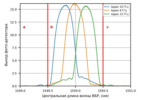 Пример спектрального отклика МАВБС, состоящий из трех адресных структур, с адресными частотами 10, 8, 12 ГГц, и центральными длинами волн 1549.8 нм, 1550.0 нм, 1550.2 нм, приведен на рисунке 3.