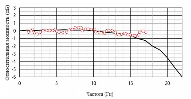 Рис. 9. Относительная АЧХ широкополосный фотодетектора Р20PE (ЛЛС): типовая – черная линия; измеренная – красные кружки