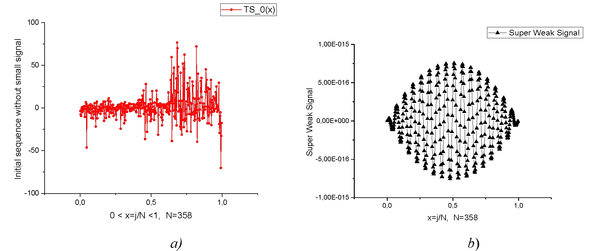 Fig. 1. Demonstration the initial TS (а) and the form of the SWS (b) taken in the form of the wave packet: (а) we show the trendless sequence TS_0(x) that is considered as initial TS. It has 358 data points with range of amplitudes Rg=146.7. (b) then we add to the TS_0(x) a small signal that is depicted as SWS