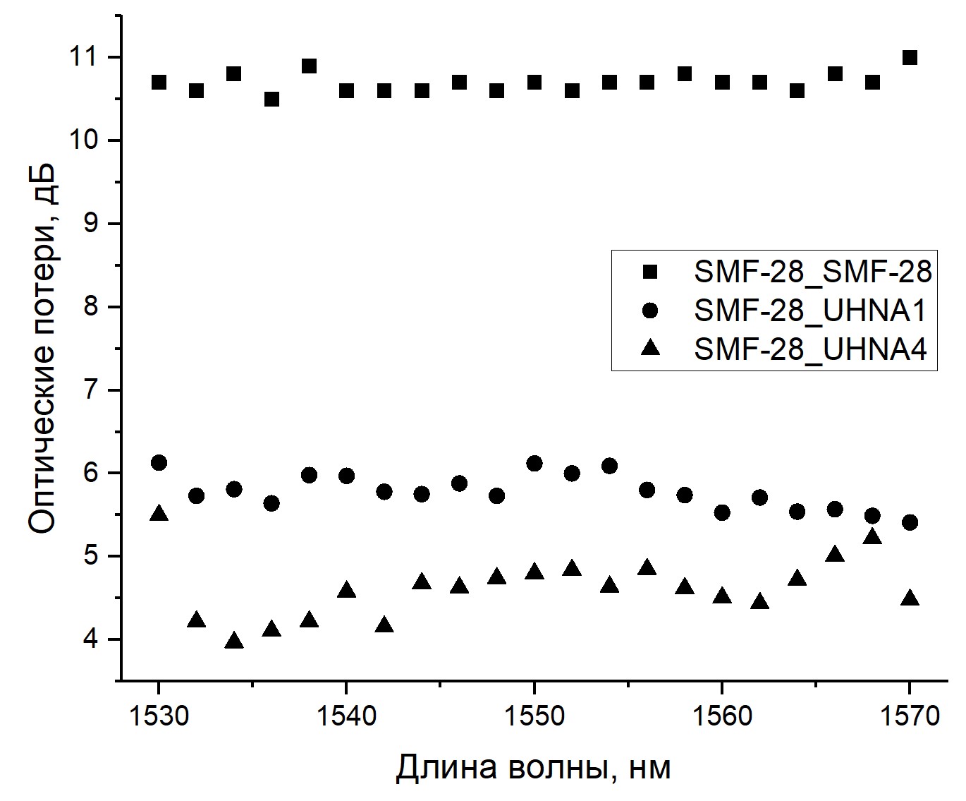 The work is devoted to the study of effective matching of fiber-optic elements with photonic integrated circuits (PIC). The optical input/output elements used are flat cleaved fibers single mode (SMF-28), and fiber optic assemblies consisting of a combination of single-mode fibers and ultra-high numerical aperture (UHNA) fibers. The dependence of the numerical value of optical losses in the 'fiber -PIC-fiber' system in the wavelength range 1530-1570 nm when using different optical elements for input/output of optical radiation is considered.