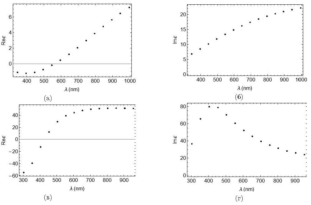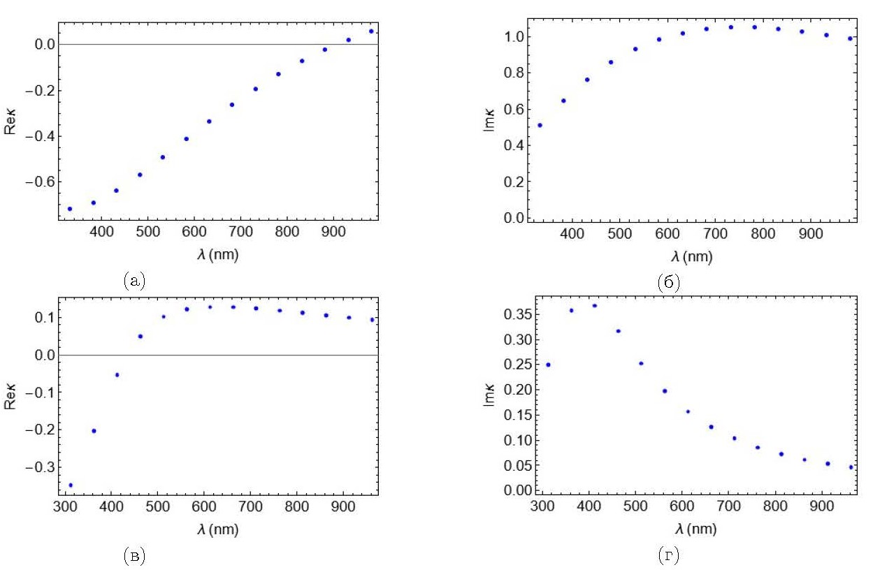 В результате поточечной минимизации функции невязки по длинам волн при фиксированной толщине слоя (𝑑 = 7 нм) была найдена дисперсионная зависимость 𝜀(𝜆), доставляющая невязке минимум (рис. 2).