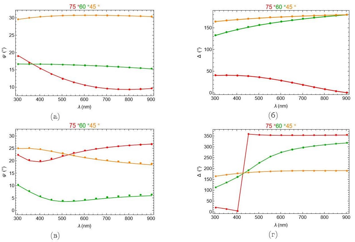 Из полученной зависимости 𝜀 (𝜆) при фиксированном параметре 𝑑 = 7 нм были рассчитаны эллипсометрические параметры 𝜓 и ∆, которые находятся в хорошем соответствии с исходными экспериментальными данными (рис. 4).