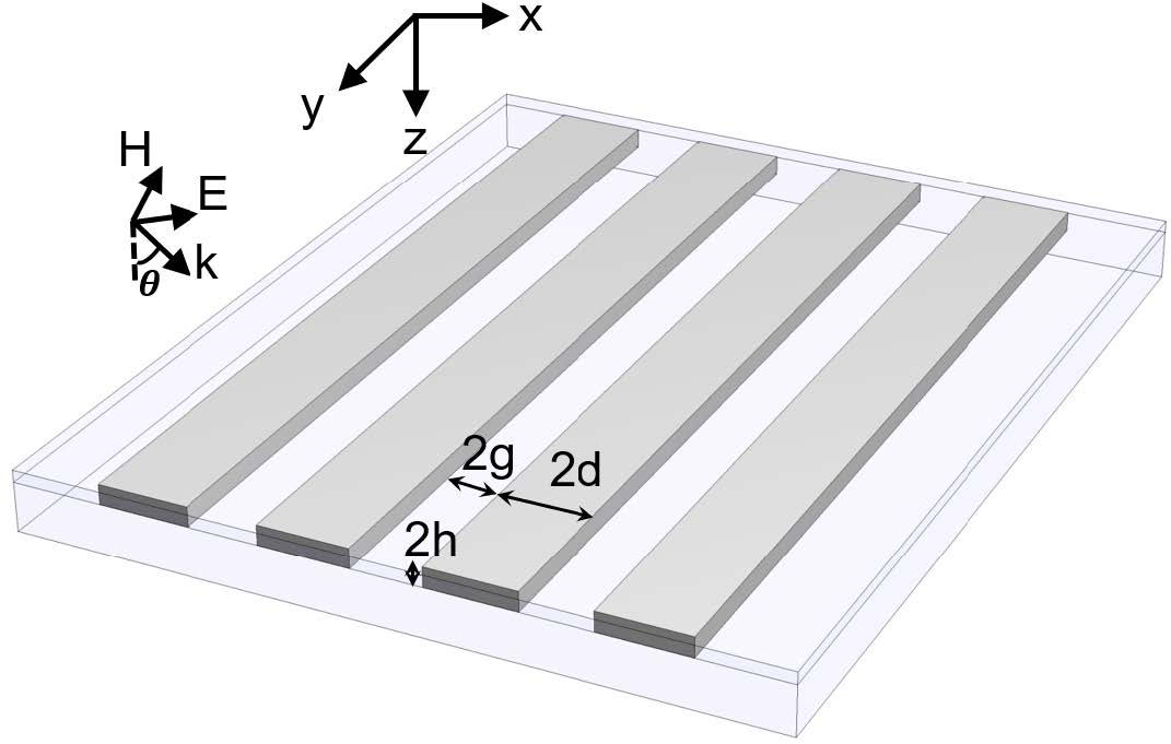 Рис. 1: Metal plasmon zebra (PZ) composed from parallel metal strips (gray color) with thickness 2h MathType@MTEF@5@5@+= feaahGart1ev3aaatCvAUfeBSjuyZL2yd9gzLbvyNv2CaerbuLwBLn hiov2DGi1BTfMBaeXatLxBI9gBaerbd9wDYLwzYbItLDharqqtubsr 4rNCHbGeaGGj0Jf9crFfpeea0xh9v8qiW7rqqrFfpeea0xe9Lq=Jc9 vqaqpepm0xbba9pwe9Q8fs0=yqaqpepae9pg0FirpepeKkFr0xfr=x fr=xb9adbaqaaeGaciGaaiaabeqaamaabaabaaGcbaGaaGOmaiaadI gaaaa@39B0@  and width 2d MathType@MTEF@5@5@+= feaahGart1ev3aaatCvAUfeBSjuyZL2yd9gzLbvyNv2CaerbuLwBLn hiov2DGi1BTfMBaeXatLxBI9gBaerbd9wDYLwzYbItLDharqqtubsr 4rNCHbGeaGGj0Jf9crFfpeea0xh9v8qiW7rqqrFfpeea0xe9Lq=Jc9 vqaqpepm0xbba9pwe9Q8fs0=yqaqpepae9pg0FirpepeKkFr0xfr=x fr=xb9adbaqaaeGaciGaaiaabeqaamaabaabaaGcbaGaaGOmaiaads gaaaa@39AC@  that are separated by interstrip gates with width 2g MathType@MTEF@5@5@+= feaahGart1ev3aaatCvAUfeBSjuyZL2yd9gzLbvyNv2CaerbuLwBLn hiov2DGi1BTfMBaeXatLxBI9gBaerbd9wDYLwzYbItLDharqqtubsr 4rNCHbGeaGGj0Jf9crFfpeea0xh9v8qiW7rqqrFfpeea0xe9Lq=Jc9 vqaqpepm0xbba9pwe9Q8fs0=yqaqpepae9pg0FirpepeKkFr0xfr=x fr=xb9adbaqaaeGaciGaaiaabeqaamaabaabaaGcbaGaaGOmaiaadE gaaaa@39AF@ ; period of PZ equals to 2(d+g) MathType@MTEF@5@5@+= feaahGart1ev3aaatCvAUfeBSjuyZL2yd9gzLbvyNv2CaerbuLwBLn hiov2DGi1BTfMBaeXatLxBI9gBaerbd9wDYLwzYbItLDharqqtubsr 4rNCHbGeaGGj0Jf9crFfpeea0xh9v8qiW7rqqrFfpeea0xe9Lq=Jc9 vqaqpepm0xbba9pwe9Q8fs0=yqaqpepae9pg0FirpepeKkFr0xfr=x fr=xb9adbaqaaeGaciGaaiaabeqaamaabaabaaGcbaGaaGOmaiaaiI cacaWGKbGaey4kaSIaam4zaiaaiMcaaaa@3CDF@ . Light is incident from above at angle θ MathType@MTEF@5@5@+= feaahGart1ev3aaatCvAUfeBSjuyZL2yd9gzLbvyNv2CaerbuLwBLn hiov2DGi1BTfMBaeXatLxBI9gBaerbd9wDYLwzYbItLDharqqtubsr 4rNCHbGeaGGj0Jf9crFfpeea0xh9v8qiW7rqqrFfpeea0xe9Lq=Jc9 vqaqpepm0xbba9pwe9Q8fs0=yqaqpepae9pg0FirpepeKkFr0xfr=x fr=xb9adbaqaaeGaciGaaiaabeqaamaabaabaaGcbaGaeqiUdehaaa@39BD@  to the normal. The metal strips are staffed between substrate with permittivity ε d MathType@MTEF@5@5@+= feaahGart1ev3aaatCvAUfeBSjuyZL2yd9gzLbvyNv2CaerbuLwBLn hiov2DGi1BTfMBaeXatLxBI9gBaerbd9wDYLwzYbItLDharqqtubsr 4rNCHbGeaGGj0Jf9crFfpeea0xh9v8qiW7rqqrFfpeea0xe9Lq=Jc9 vqaqpepm0xbba9pwe9Q8fs0=yqaqpepae9pg0FirpepeKkFr0xfr=x fr=xb9adbaqaaeGaciGaaiaabeqaamaabaabaaGcbaGaeqyTdu2aaS baaSqaaiaadsgaaeqaaaaa@3AC3@  and upper dielectric protective layer with permittivity ε e MathType@MTEF@5@5@+= feaahGart1ev3aaatCvAUfeBSjuyZL2yd9gzLbvyNv2CaerbuLwBLn hiov2DGi1BTfMBaeXatLxBI9gBaerbd9wDYLwzYbItLDharqqtubsr 4rNCHbGeaGGj0Jf9crFfpeea0xh9v8qiW7rqqrFfpeea0xe9Lq=Jc9 vqaqpepm0xbba9pwe9Q8fs0=yqaqpepae9pg0FirpepeKkFr0xfr=x fr=xb9adbaqaaeGaciGaaiaabeqaamaabaabaaGcbaGaeqyTdu2aaS baaSqaaiaadwgaaeqaaaaa@3AC4@ .