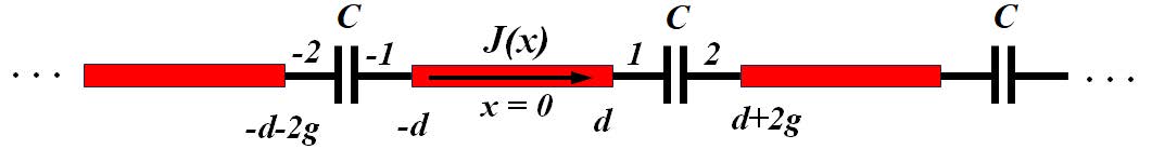 Рис. 3: Lumped circuit of plasmon zebra with period 2d+2g MathType@MTEF@5@5@+= feaahGart1ev3aaatCvAUfeBSjuyZL2yd9gzLbvyNv2CaerbuLwBLn hiov2DGi1BTfMBaeXatLxBI9gBaerbd9wDYLwzYbItLDharqqtubsr 4rNCHbGeaGGj0Jf9crFfpeea0xh9v8qiW7rqqrFfpeea0xe9Lq=Jc9 vqaqpepm0xbba9pwe9Q8fs0=yqaqpepae9pg0FirpepeKkFr0xfr=x fr=xb9adbaqaaeGaciGaaiaabeqaamaabaabaaGcbaGaaGOmaiaads gacqGHRaWkcaaIYaGaam4zaaaa@3C36@ ; electric current J(x) MathType@MTEF@5@5@+= feaahGart1ev3aaatCvAUfeBSjuyZL2yd9gzLbvyNv2CaerbuLwBLn hiov2DGi1BTfMBaeXatLxBI9gBaerbd9wDYLwzYbItLDharqqtubsr 4rNCHbGeaGGj0Jf9crFfpeea0xh9v8qiW7rqqrFfpeea0xe9Lq=Jc9 vqaqpepm0xbba9pwe9Q8fs0=yqaqpepae9pg0FirpepeKkFr0xfr=x fr=xb9adbaqaaeGaciGaaiaabeqaamaabaabaaGcbaGaamOsaiaaiI cacaWG4bGaaGykaaaa@3B38@  flows in metal nanostrips that are connected via interstrip capacitance C MathType@MTEF@5@5@+= feaahGart1ev3aaatCvAUfeBSjuyZL2yd9gzLbvyNv2CaerbuLwBLn hiov2DGi1BTfMBaeXatLxBI9gBaerbd9wDYLwzYbItLDharqqtubsr 4rNCHbGeaGGj0Jf9crFfpeea0xh9v8qiW7rqqrFfpeea0xe9Lq=Jc9 vqaqpepm0xbba9pwe9Q8fs0=yqaqpepae9pg0FirpepeKkFr0xfr=x fr=xb9adbaqaaeGaciGaaiaabeqaamaabaabaaGcbaGaam4qaaaa@38CF@ .