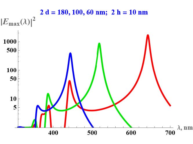 Рис. 4: Electric field enhancement in PZ illuminate by light impinged normal to PZ plane; metal strip thickness 2h=10nm MathType@MTEF@5@5@+= feaahGart1ev3aaatCvAUfeBSjuyZL2yd9gzLbvyNv2CaerbuLwBLn hiov2DGi1BTfMBaeXatLxBI9gBaerbd9wDYLwzYbItLDharqqtubsr 4rNCHbGeaGGj0Jf9crFfpeea0xh9v8qiW7rqqrFfpeea0xe9Lq=Jc9 vqaqpepm0xbba9pwe9Q8fs0=yqaqpepae9pg0FirpepeKkFr0xfr=x fr=xb9adbaqaaeGaciGaaiaabeqaamaabaabaaGcbaGaaGOmaiaadI gacaaI9aGaaGymaiaaicdacaaMi8UaamOBaiaad2gaaaa@3F62@ , interstrip gap 2g=40nm MathType@MTEF@5@5@+= feaahGart1ev3aaatCvAUfeBSjuyZL2yd9gzLbvyNv2CaerbuLwBLn hiov2DGi1BTfMBaeXatLxBI9gBaerbd9wDYLwzYbItLDharqqtubsr 4rNCHbGeaGGj0Jf9crFfpeea0xh9v8qiW7rqqrFfpeea0xe9Lq=Jc9 vqaqpepm0xbba9pwe9Q8fs0=yqaqpepae9pg0FirpepeKkFr0xfr=x fr=xb9adbaqaaeGaciGaaiaabeqaamaabaabaaGcbaGaaGOmaiaadE gacaaI9aGaaGinaiaaicdacaaMi8UaamOBaiaad2gaaaa@3F64@ , strip width 2d=180,100,60nm MathType@MTEF@5@5@+= feaahGart1ev3aaatCvAUfeBSjuyZL2yd9gzLbvyNv2CaerbuLwBLn hiov2DGi1BTfMBaeXatLxBI9gBaerbd9wDYLwzYbItLDharqqtubsr 4rNCHbGeaGGj0Jf9crFfpeea0xh9v8qiW7rqqrFfpeea0xe9Lq=Jc9 vqaqpepm0xbba9pwe9Q8fs0=yqaqpepae9pg0FirpepeKkFr0xfr=x fr=xb9adbaqaaeGaciGaaiaabeqaamaabaabaaGcbaGaaGOmaiaads gacaaI9aGaaGymaiaaiIdacaaIWaGaaGilaiaaigdacaaIWaGaaGim aiaaiYcacaaI2aGaaGimaiaayIW7caWGUbGaamyBaaaa@4535@  (red, green, blue); amplitude of incident light E 0 =1 MathType@MTEF@5@5@+= feaahGart1ev3aaatCvAUfeBSjuyZL2yd9gzLbvyNv2CaerbuLwBLn hiov2DGi1BTfMBaeXatLxBI9gBaerbd9wDYLwzYbItLDharqqtubsr 4rNCHbGeaGGj0Jf9crFfpeea0xh9v8qiW7rqqrFfpeea0xe9Lq=Jc9 vqaqpepm0xbba9pwe9Q8fs0=yqaqpepae9pg0FirpepeKkFr0xfr=x fr=xb9adbaqaaeGaciGaaiaabeqaamaabaabaaGcbaGaamyramaaBa aaleaacaaIWaaabeaakiaai2dacaaIXaaaaa@3B43@ .