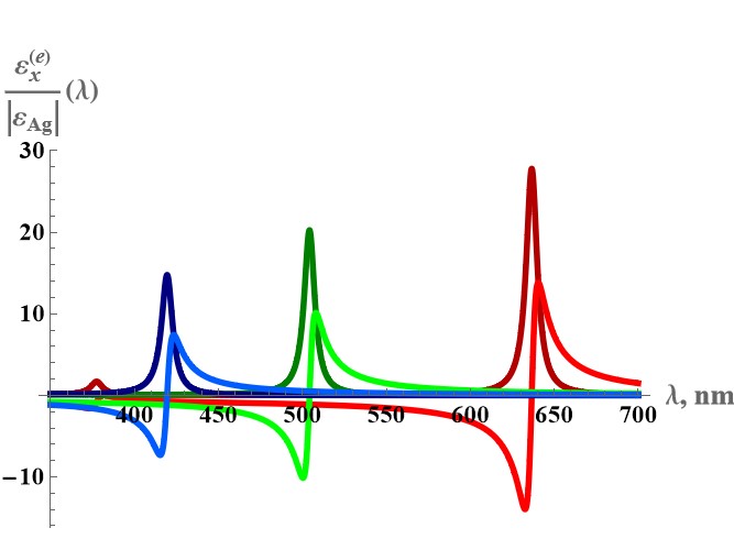 Рис. 5: Ratio of real and imaginary parts of the effective zebra permittivity ε x (e) = ε x (e) +i ε x (e) MathType@MTEF@5@5@+= feaahGart1ev3aaatCvAUfeBSjuyZL2yd9gzLbvyNv2CaerbuLwBLn hiov2DGi1BTfMBaeXatLxBI9gBaerbd9wDYLwzYbItLDharqqtubsr 4rNCHbGeaGGj0Jf9crFfpeea0xh9v8qiW7rqqrFfpeea0xe9Lq=Jc9 vqaqpepm0xbba9pwe9Q8fs0=yqaqpepae9pg0FirpepeKkFr0xfr=x fr=xb9adbaqaaeGaciGaaiaabeqaamaabaabaaGcbaGaeqyTdu2aa0 baaSqaaiaadIhaaeaacaaIOaGaamyzaiaaiMcaaaGccaaI9aGafqyT duMbauaadaqhaaWcbaGaamiEaaqaaiaaiIcacaWGLbGaaGykaaaaki abgUcaRiaadMgacuaH1oqzgaqbgaqbamaaDaaaleaacaWG4baabaGa aGikaiaadwgacaaIPaaaaaaa@4A35@  to silver permittivity ε Ag MathType@MTEF@5@5@+= feaahGart1ev3aaatCvAUfeBSjuyZL2yd9gzLbvyNv2CaerbuLwBLn hiov2DGi1BTfMBaeXatLxBI9gBaerbd9wDYLwzYbItLDharqqtubsr 4rNCHbGeaGGj0Jf9crFfpeea0xh9v8qiW7rqqrFfpeea0xe9Lq=Jc9 vqaqpepm0xbba9pwe9Q8fs0=yqaqpepae9pg0FirpepeKkFr0xfr=x fr=xb9adbaqaaeGaciGaaiaabeqaamaabaabaaGcbaGaeqyTdu2aaS baaSqaaiaadgeacaWGNbaabeaaaaa@3B8C@ ; red and dark red strip width 2d=180nm MathType@MTEF@5@5@+= feaahGart1ev3aaatCvAUfeBSjuyZL2yd9gzLbvyNv2CaerbuLwBLn hiov2DGi1BTfMBaeXatLxBI9gBaerbd9wDYLwzYbItLDharqqtubsr 4rNCHbGeaGGj0Jf9crFfpeea0xh9v8qiW7rqqrFfpeea0xe9Lq=Jc9 vqaqpepm0xbba9pwe9Q8fs0=yqaqpepae9pg0FirpepeKkFr0xfr=x fr=xb9adbaqaaeGaciGaaiaabeqaamaabaabaaGcbaGaaGOmaiaads gacaaI9aGaaGymaiaaiIdacaaIWaGaaGjcVlaad6gacaWGTbaaaa@4020@ , green and dark green 2d=100nm MathType@MTEF@5@5@+= feaahGart1ev3aaatCvAUfeBSjuyZL2yd9gzLbvyNv2CaerbuLwBLn hiov2DGi1BTfMBaeXatLxBI9gBaerbd9wDYLwzYbItLDharqqtubsr 4rNCHbGeaGGj0Jf9crFfpeea0xh9v8qiW7rqqrFfpeea0xe9Lq=Jc9 vqaqpepm0xbba9pwe9Q8fs0=yqaqpepae9pg0FirpepeKkFr0xfr=x fr=xb9adbaqaaeGaciGaaiaabeqaamaabaabaaGcbaGaaGOmaiaads gacaaI9aGaaGymaiaaicdacaaIWaGaaGjcVlaad6gacaWGTbaaaa@4018@ , blue and dark blue 2d=60nm MathType@MTEF@5@5@+= feaahGart1ev3aaatCvAUfeBSjuyZL2yd9gzLbvyNv2CaerbuLwBLn hiov2DGi1BTfMBaeXatLxBI9gBaerbd9wDYLwzYbItLDharqqtubsr 4rNCHbGeaGGj0Jf9crFfpeea0xh9v8qiW7rqqrFfpeea0xe9Lq=Jc9 vqaqpepm0xbba9pwe9Q8fs0=yqaqpepae9pg0FirpepeKkFr0xfr=x fr=xb9adbaqaaeGaciGaaiaabeqaamaabaabaaGcbaGaaGOmaiaads gacaaI9aGaaGOnaiaaicdacaaMi8UaamOBaiaad2gaaaa@3F63@ ; metal strip thickness 2h=10nm MathType@MTEF@5@5@+= feaahGart1ev3aaatCvAUfeBSjuyZL2yd9gzLbvyNv2CaerbuLwBLn hiov2DGi1BTfMBaeXatLxBI9gBaerbd9wDYLwzYbItLDharqqtubsr 4rNCHbGeaGGj0Jf9crFfpeea0xh9v8qiW7rqqrFfpeea0xe9Lq=Jc9 vqaqpepm0xbba9pwe9Q8fs0=yqaqpepae9pg0FirpepeKkFr0xfr=x fr=xb9adbaqaaeGaciGaaiaabeqaamaabaabaaGcbaGaaGOmaiaadI gacaaI9aGaaGymaiaaicdacaaMi8UaamOBaiaad2gaaaa@3F62@ , interstrip gap 2g=40nm MathType@MTEF@5@5@+= feaahGart1ev3aaatCvAUfeBSjuyZL2yd9gzLbvyNv2CaerbuLwBLn hiov2DGi1BTfMBaeXatLxBI9gBaerbd9wDYLwzYbItLDharqqtubsr 4rNCHbGeaGGj0Jf9crFfpeea0xh9v8qiW7rqqrFfpeea0xe9Lq=Jc9 vqaqpepm0xbba9pwe9Q8fs0=yqaqpepae9pg0FirpepeKkFr0xfr=x fr=xb9adbaqaaeGaciGaaiaabeqaamaabaabaaGcbaGaaGOmaiaadE gacaaI9aGaaGinaiaaicdacaaMi8UaamOBaiaad2gaaaa@3F64@ .