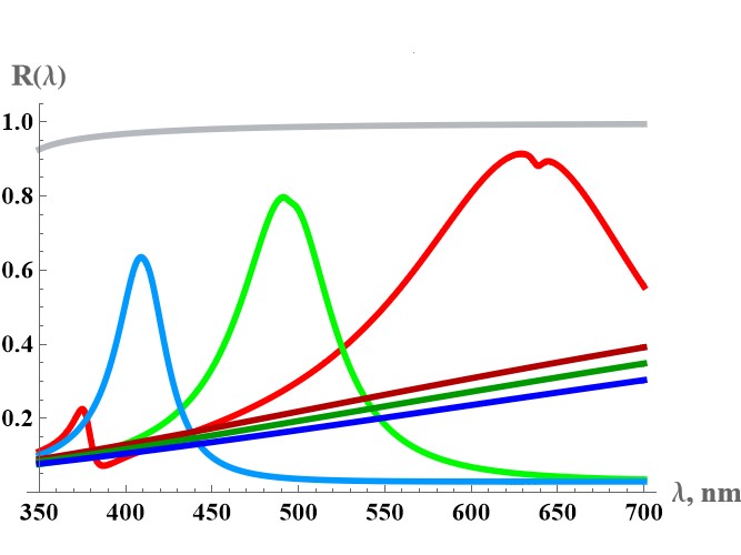 Рис. 7: Color of silver zebra with thickness 2h=10nm MathType@MTEF@5@5@+= feaahGart1ev3aaatCvAUfeBSjuyZL2yd9gzLbvyNv2CaerbuLwBLn hiov2DGi1BTfMBaeXatLxBI9gBaerbd9wDYLwzYbItLDharqqtubsr 4rNCHbGeaGGj0Jf9crFfpeea0xh9v8qiW7rqqrFfpeea0xe9Lq=Jc9 vqaqpepm0xbba9pwe9Q8fs0=yqaqpepae9pg0FirpepeKkFr0xfr=x fr=xb9adbaqaaeGaciGaaiaabeqaamaabaabaaGcbaGaaGOmaiaadI gacaaI9aGaaGymaiaaicdacaaMi8UaamOBaiaad2gaaaa@3F62@ , interstrip gap 2g=40nm MathType@MTEF@5@5@+= feaahGart1ev3aaatCvAUfeBSjuyZL2yd9gzLbvyNv2CaerbuLwBLn hiov2DGi1BTfMBaeXatLxBI9gBaerbd9wDYLwzYbItLDharqqtubsr 4rNCHbGeaGGj0Jf9crFfpeea0xh9v8qiW7rqqrFfpeea0xe9Lq=Jc9 vqaqpepm0xbba9pwe9Q8fs0=yqaqpepae9pg0FirpepeKkFr0xfr=x fr=xb9adbaqaaeGaciGaaiaabeqaamaabaabaaGcbaGaaGOmaiaadE gacaaI9aGaaGinaiaaicdacaaMi8UaamOBaiaad2gaaaa@3F64@ , that is deposited on glass substrate ε e =1, ε d =2 MathType@MTEF@5@5@+= feaahGart1ev3aaatCvAUfeBSjuyZL2yd9gzLbvyNv2CaerbuLwBLn hiov2DGi1BTfMBaeXatLxBI9gBaerbd9wDYLwzYbItLDharqqtubsr 4rNCHbGeaGGj0Jf9crFfpeea0xh9v8qiW7rqqrFfpeea0xe9Lq=Jc9 vqaqpepm0xbba9pwe9Q8fs0=yqaqpepae9pg0FirpepeKkFr0xfr=x fr=xb9adbaqaaeGaciGaaiaabeqaamaabaabaaGcbaGaeqyTdu2aaS baaSqaaiaadwgaaeqaaOGaaGypaiaaigdacaaISaGaaGjbVlabew7a LnaaBaaaleaacaWGKbaabeaakiaai2dacaaIYaaaaa@42DC@ ; 1, 2, 3 MathType@MTEF@5@5@+= feaahGart1ev3aqatCvAUfeBSjuyZL2yd9gzLbvyNv2CaerbuLwBLn hiov2DGi1BTfMBaeXatLxBI9gBaerbd9wDYLwzYbItLDharqqtubsr 4rNCHbGeaGqiVu0Je9sqqrpepC0xbbL8F4rqqrFfpeea0xe9Lq=Jc9 vqaqpepm0xbba9pwe9Q8fs0=yqaqpepae9pg0FirpepeKkFr0xfr=x fr=xb9adbaqaaeGaciGaaiaabeqaamaabaabaaGcbaqefmuySLMyYL gaiuqajugGbabaaaaaaaaapeGaa83eGaaa@3A95@  color of PZ with strip width 2d=200nm MathType@MTEF@5@5@+= feaahGart1ev3aaatCvAUfeBSjuyZL2yd9gzLbvyNv2CaerbuLwBLn hiov2DGi1BTfMBaeXatLxBI9gBaerbd9wDYLwzYbItLDharqqtubsr 4rNCHbGeaGGj0Jf9crFfpeea0xh9v8qiW7rqqrFfpeea0xe9Lq=Jc9 vqaqpepm0xbba9pwe9Q8fs0=yqaqpepae9pg0FirpepeKkFr0xfr=x fr=xb9adbaqaaeGaciGaaiaabeqaamaabaabaaGcbaGaaGOmaiaads gacaaI9aGaaGOmaiaaicdacaaIWaGaaGjcVlaad6gacaWGTbaaaa@4019@ , 2d=120nm MathType@MTEF@5@5@+= feaahGart1ev3aaatCvAUfeBSjuyZL2yd9gzLbvyNv2CaerbuLwBLn hiov2DGi1BTfMBaeXatLxBI9gBaerbd9wDYLwzYbItLDharqqtubsr 4rNCHbGeaGGj0Jf9crFfpeea0xh9v8qiW7rqqrFfpeea0xe9Lq=Jc9 vqaqpepm0xbba9pwe9Q8fs0=yqaqpepae9pg0FirpepeKkFr0xfr=x fr=xb9adbaqaaeGaciGaaiaabeqaamaabaabaaGcbaGaaGOmaiaads gacaaI9aGaaGymaiaaikdacaaIWaGaaGjcVlaad6gacaWGTbaaaa@401A@ , and 2d=80nm MathType@MTEF@5@5@+= feaahGart1ev3aaatCvAUfeBSjuyZL2yd9gzLbvyNv2CaerbuLwBLn hiov2DGi1BTfMBaeXatLxBI9gBaerbd9wDYLwzYbItLDharqqtubsr 4rNCHbGeaGGj0Jf9crFfpeea0xh9v8qiW7rqqrFfpeea0xe9Lq=Jc9 vqaqpepm0xbba9pwe9Q8fs0=yqaqpepae9pg0FirpepeKkFr0xfr=x fr=xb9adbaqaaeGaciGaaiaabeqaamaabaabaaGcbaGaaGOmaiaads gacaaI9aGaaGioaiaaicdacaaMi8UaamOBaiaad2gaaaa@3F65@ , 4 MathType@MTEF@5@5@+= feaahGart1ev3aqatCvAUfeBSjuyZL2yd9gzLbvyNv2CaerbuLwBLn hiov2DGi1BTfMBaeXatLxBI9gBaerbd9wDYLwzYbItLDharqqtubsr 4rNCHbGeaGqiVu0Je9sqqrpepC0xbbL8F4rqqrFfpeea0xe9Lq=Jc9 vqaqpepm0xbba9pwe9Q8fs0=yqaqpepae9pg0FirpepeKkFr0xfr=x fr=xb9adbaqaaeGaciGaaiaabeqaamaabaabaaGcbaqefmuySLMyYL gaiuqajugGbabaaaaaaaaapeGaa83eGaaa@3A95@ bulk silver plate.