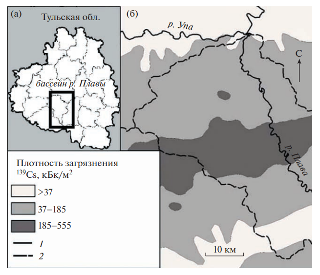 Бассейн р. Плавы площадью около 1890 км 2 расположен в северной части Среднерусской возвышенности в пределах Тульской области и относится к бассейну р. Упы. Годовой слой осадков составляет 630 мм, причем в теплое время года в среднем выпадает порядка 460 мм. Почвенный покров в пределах междуречных пространств представлен черноземами выщелоченными и оподзоленными, а также темно-серыми лесными почвами. Основной почвообразующей породой являются карбонатные лёссовидные суглинки (Ратников, 1960). Характерной чертой рельефа являются плоские междуречья, занимающие наибольшие площади в верховьях рек с преимущественно пологими, выпуклыми склонами длиной до нескольких сотен метров. В начале 1980-х гг. плотность загрязнения 137 Cs бассейна р. Плавы не превышала 7.2 кБк/м 2 (0.2 Ки/км 2 ). После аварии на ЧАЭС в апреле 1986 г. в результате атмосферных выпадений возникло так называемое “Плавское радиоактивное пятно” с уровнем загрязнения свыше 185 кБк/м 2 (5 Ки/км 2 ) (Izrael et al., 1996), получившее свое название по городу Плавску, расположенному в его осевой зоне ( рис. 1 ).