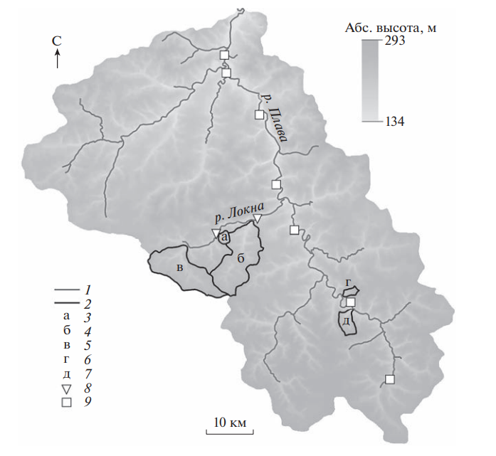 Рис. 2. Расположение ключевых малых водосборов и площадок исследования пойм в бассейне р. Плавы. 1 – реки; 2 – границы ключевых водосборов; ключевые водосборы: 3 – Лапки, 4 – Часовенков Верх, 5 – Верховья Локны, 6 – Святой Источник, 7 – Ляпуновка; площадки исследования пойм: 8 – на р. Локне, 9 – на р. Плаве. Fig. 2 . The location of the small key catchments and observation sites of the flood plains. 1 – rivers; 2 – the key catchment boundaries; key catchments: 3 – Lapki, 4 – Chasovenkov Verkh, 5 – Upper Lokna, 6 – Svyatoi Istochnik, 7 – Lyapunovka; floodplain observation sites: 8 – of the Lokna River, 9 – of the Plava River.